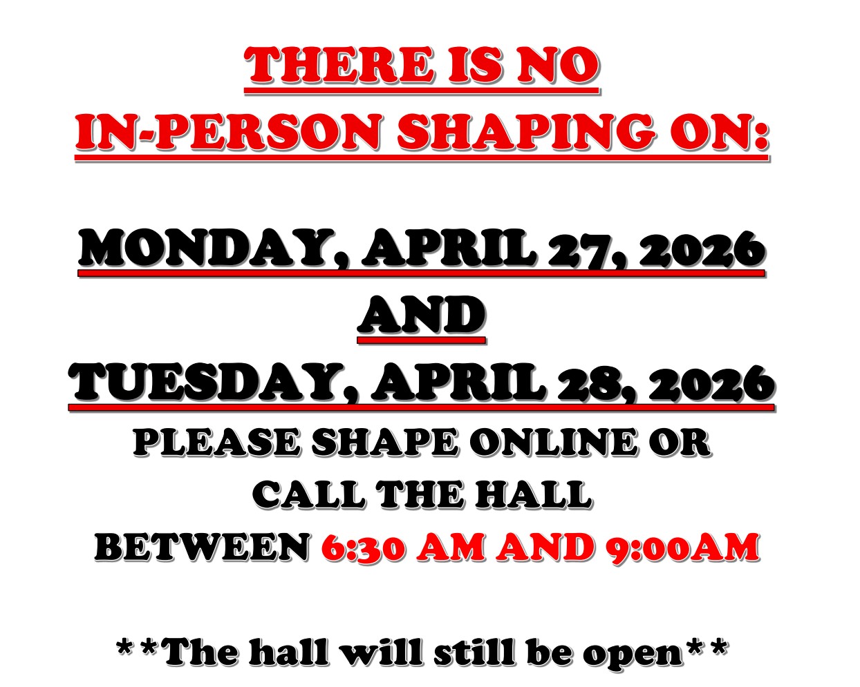 NO IN-PERSON SHAPING – April 27th & April 28th, 2026